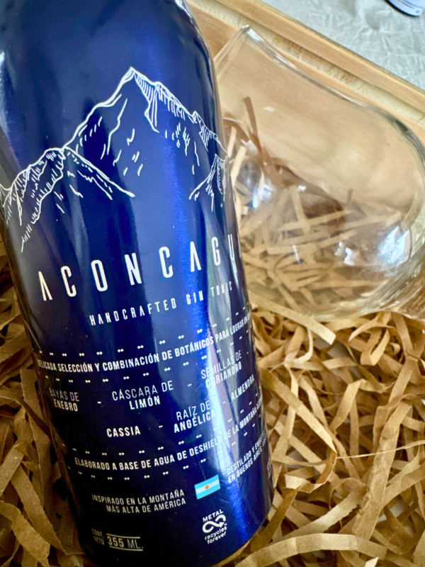 Gin artesanal Aconcagua (elaborado en Buenos Aires, Argentina): nspirado en la montaña más alta de América, este gin se destila con agua de deshielo y una cuidadosa selección de siete botánicos: bayas de enebro, semillas de coriandro, raíz de angélica, raíz de regaliz, almendra, cassia y cáscara de limón. De sabor equilibrado, fresco y aromático, presenta notas cítricas, florales y especiadas. Su graduación alcohólica del 43% le otorga un carácter intenso y persistente.
